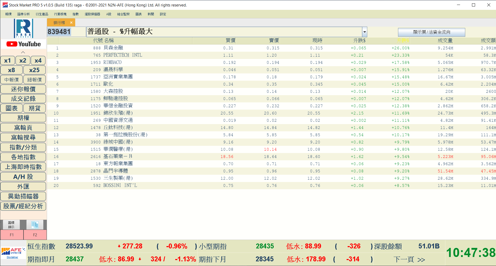 Raga 股市寶支援下載版,提供即時報價、互動圖表及各類分析工具,集合即時財經新聞、專家分析及重點推介股,用戶能享受更豐富快捷的投資分析體驗,早人一步把握投資先機。除了基本功能,Raga 股市寶亦提供資金盤路、期貨盤路、大戶盤路及程式選股等功能助客戶進一步剖析大市,從而更有效率地作出明智投資決策。